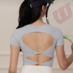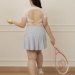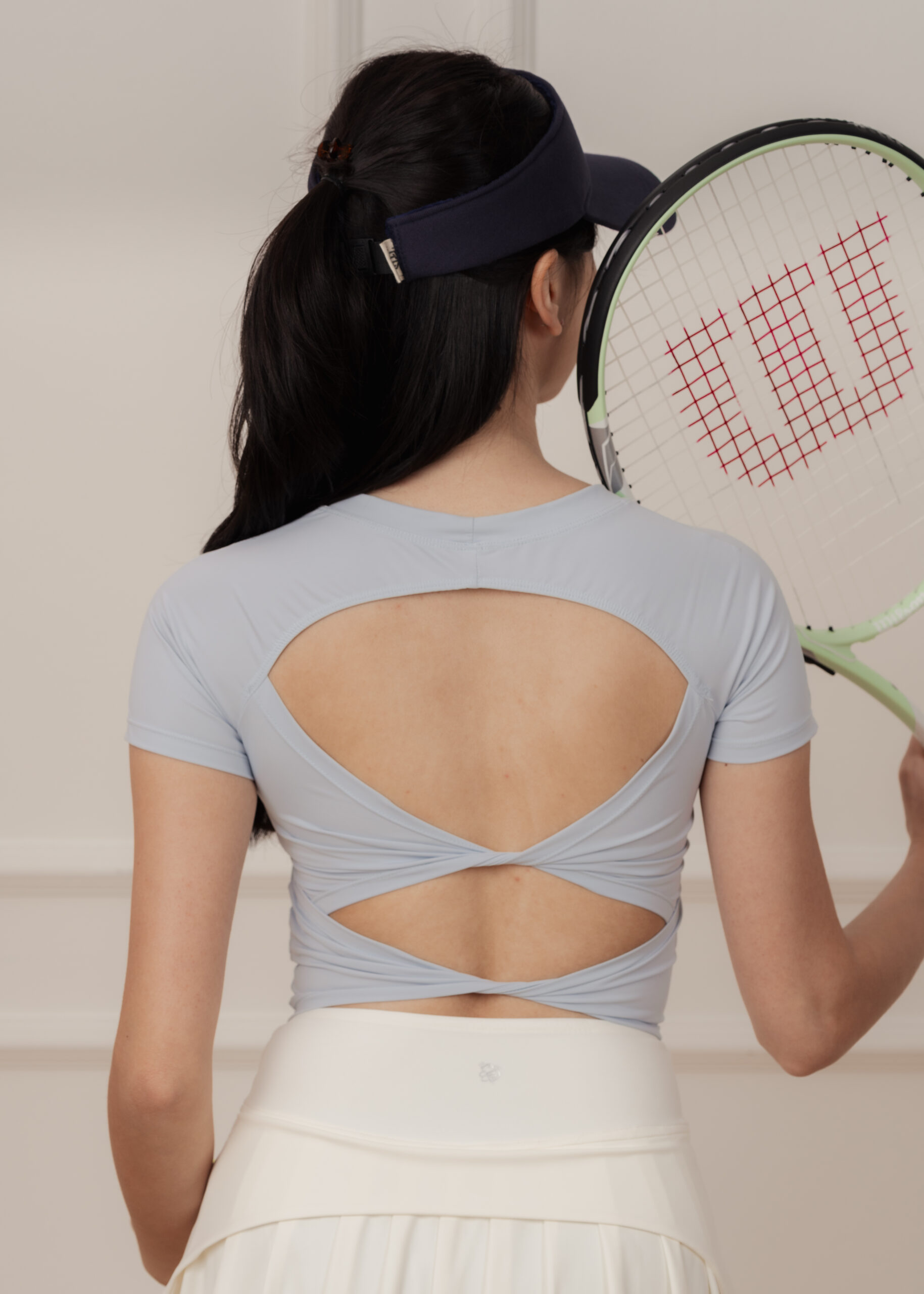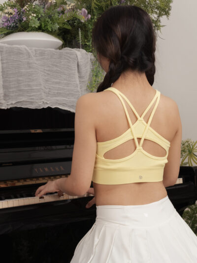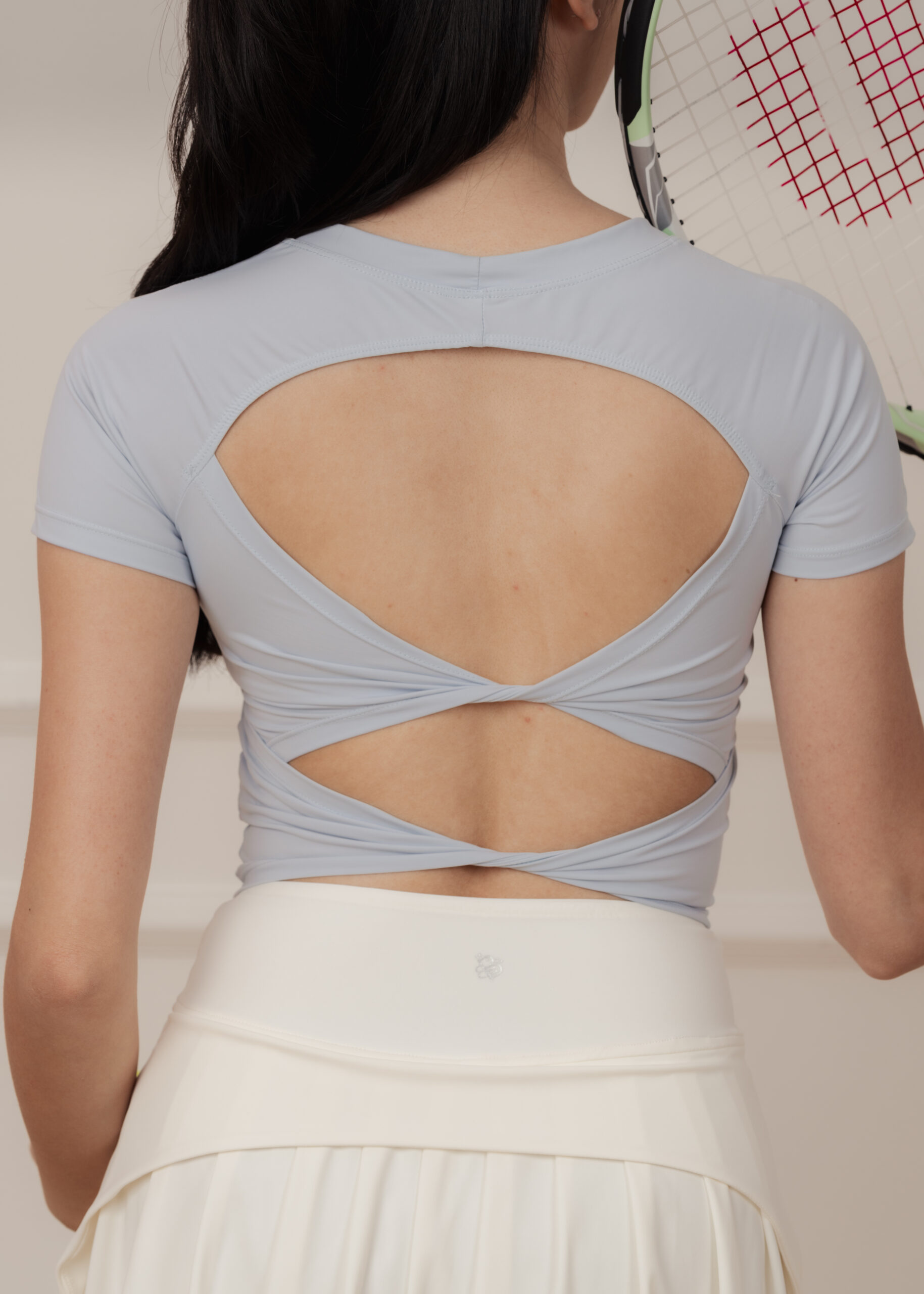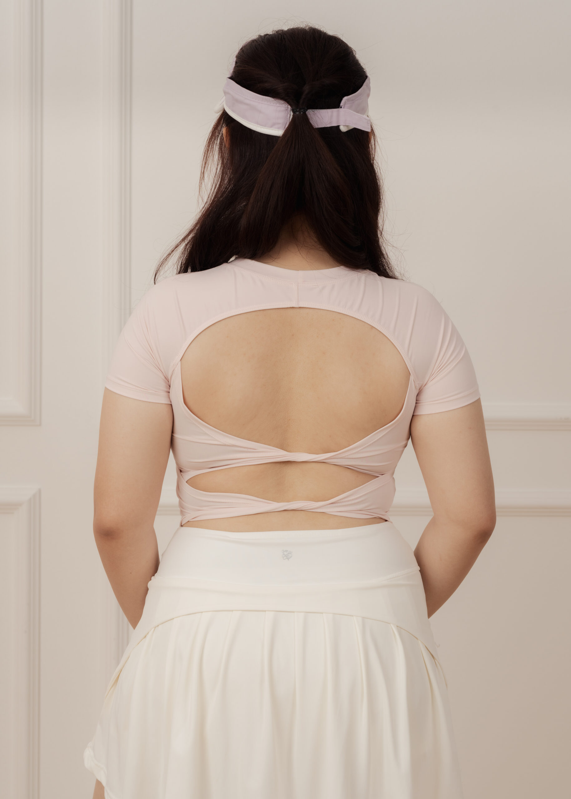 - Double-knots open-back design softens the back’s contours and add a striking touch when turning around